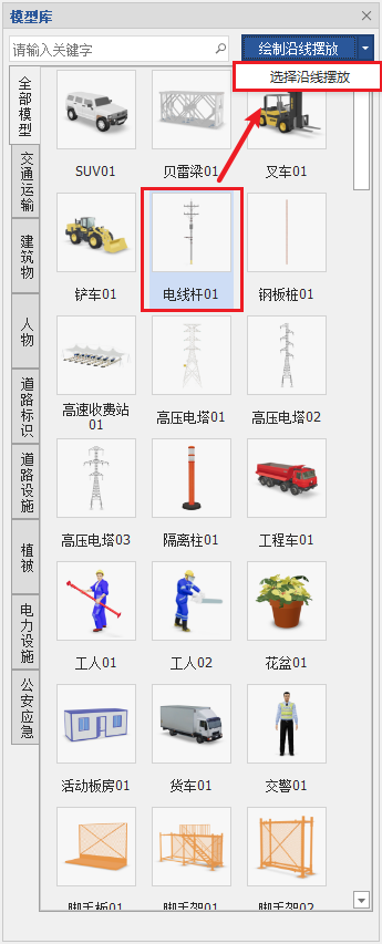 (2)如果是已有摆放路线,可点击“选择沿线摆放”,在场景中选择已有需要摆放该模型的路线;
